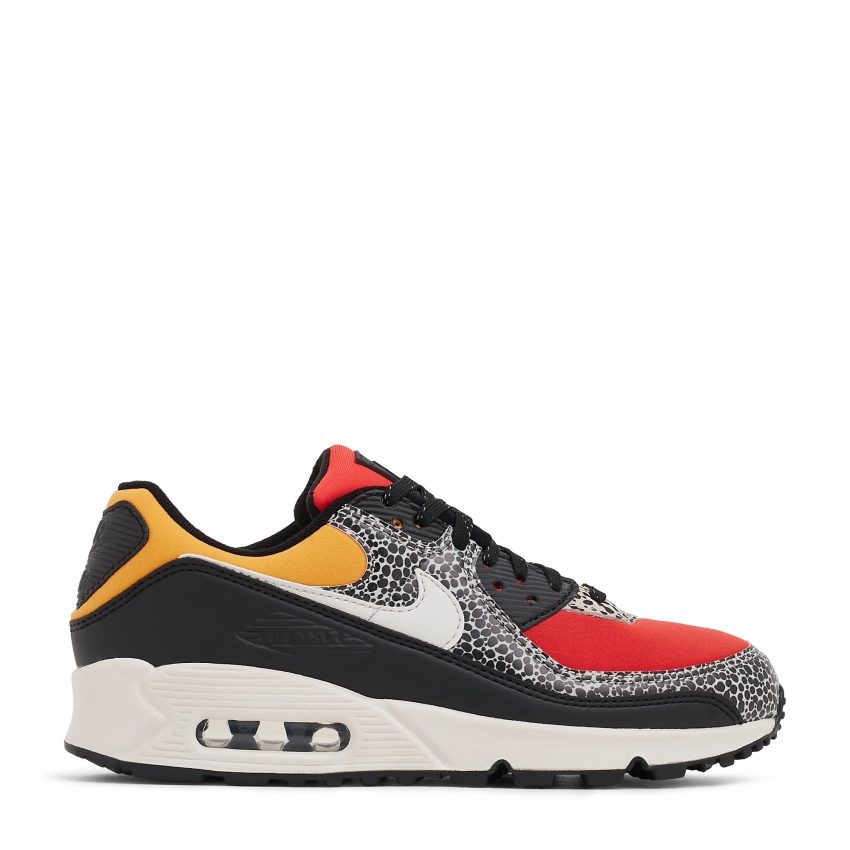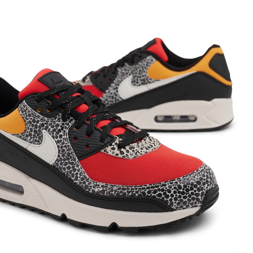 The Nike Air Max 90 SE ’Safari’ sneakers are presented in a black, Phantom, Chile Red, and Pollen colourway. Debuted on the Nike Air Safari in 1987, the ostrich printed pattern is featured on the forefoot and mid-foot allowing the print to take centre stage. These are sure to be a conversation starter!