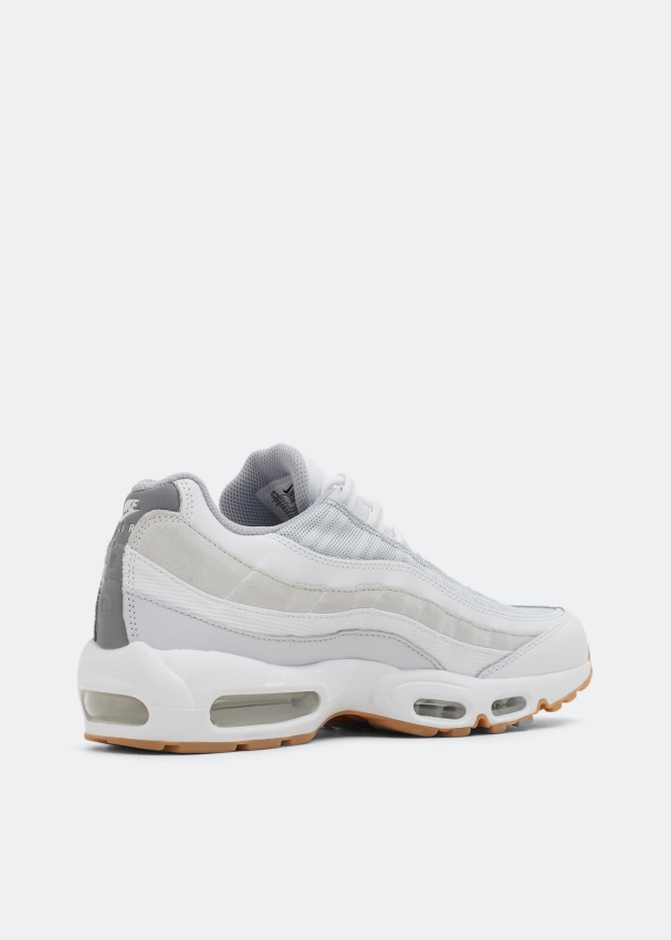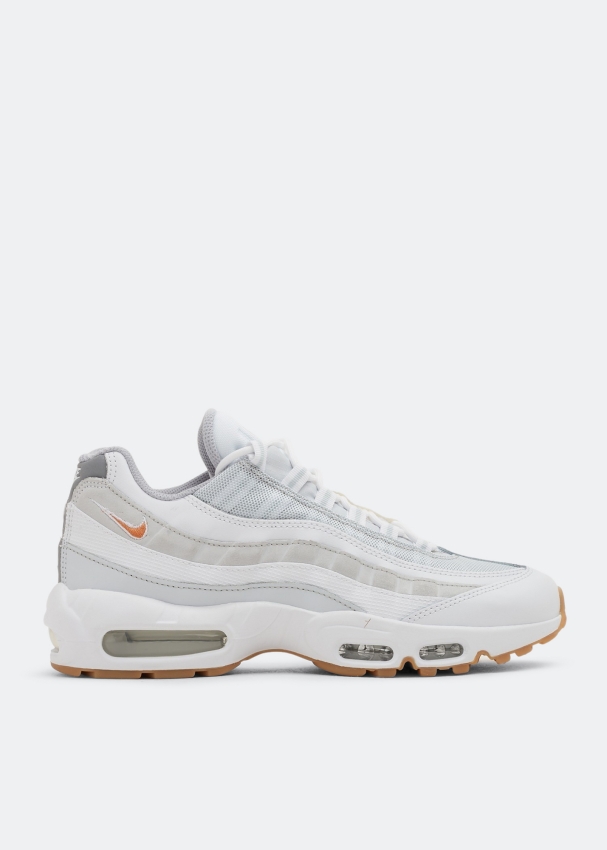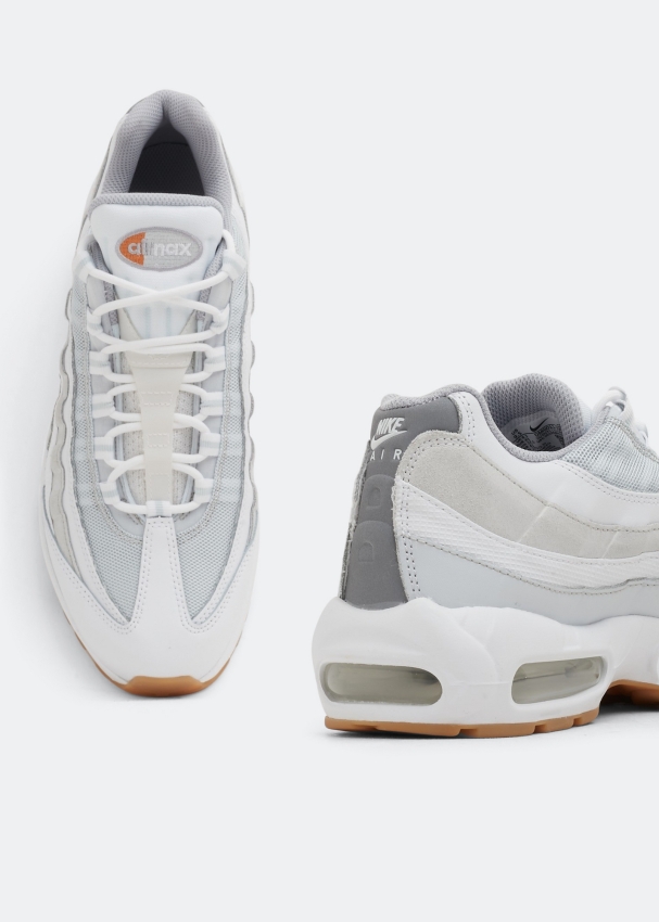 Moving with strength and fluidity, these Nike Air Max 95 Essential sneakers are designed with an innovative lacing system that creates a custom fit. Made from leather, suede and mesh, these shoes feature a White, Hot Curry, Pure Platinum, and Wolf Grey colourway, reflective accents, and classic flex grooves on the outsole for natural movement.