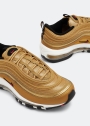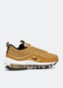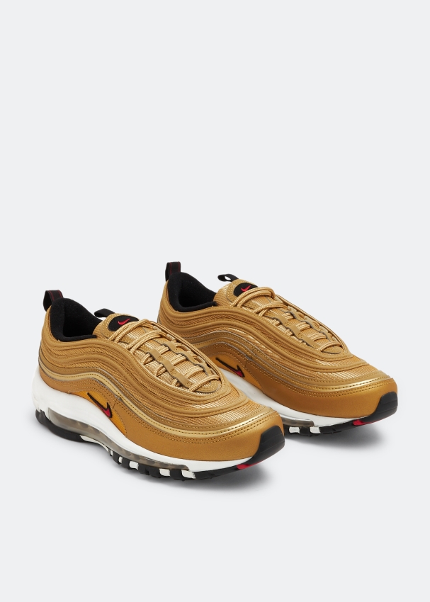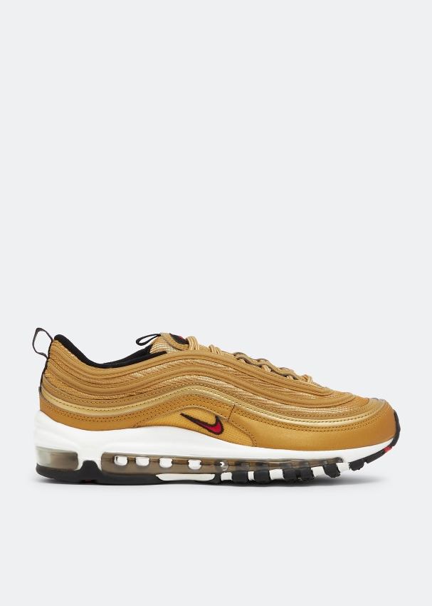 Presented in a 'Golden Bullet' colourway, the Air Max 97 sneakers by Nike come with a usual mesh build with leather overlays. Other key details include 3M reflective detailing atop a White midsole, a wavy silhouette, an Air Max unit, Swoosh detail, and a Black rubber outsole.