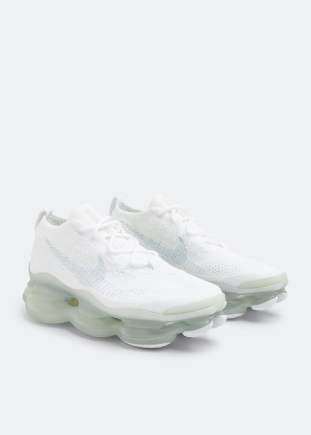 Presented in a white knit, these Nike Air Max Scorpion 'White' sneakers are detailed with slightly contrasting Swooshes and branding. Other key features include a breathable woven upper, pull-tab and a smoky translucent outsole in the signature wide and oversized shape for a cushioned and supportive feel.